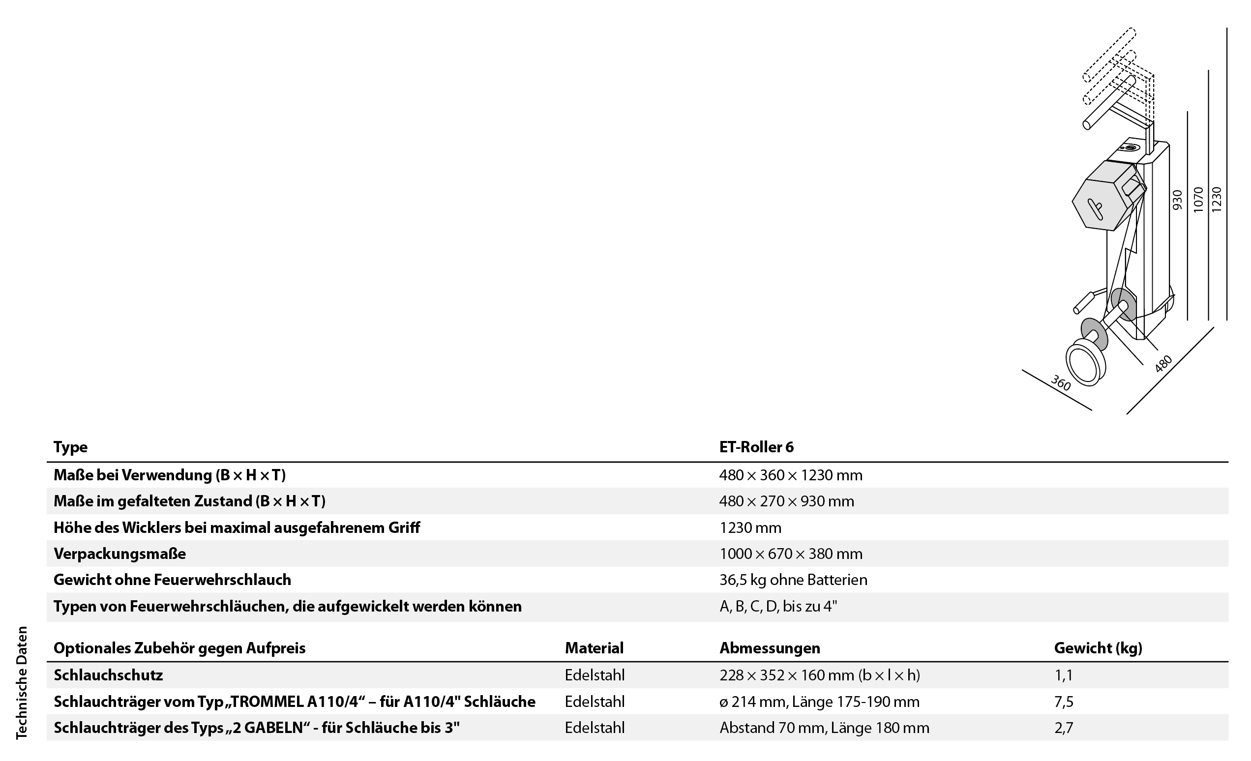 - Schnelles und komfortables Aufwickeln von trockenen und nassen Feuerwehrschläuchen unterschiedlicher Größen