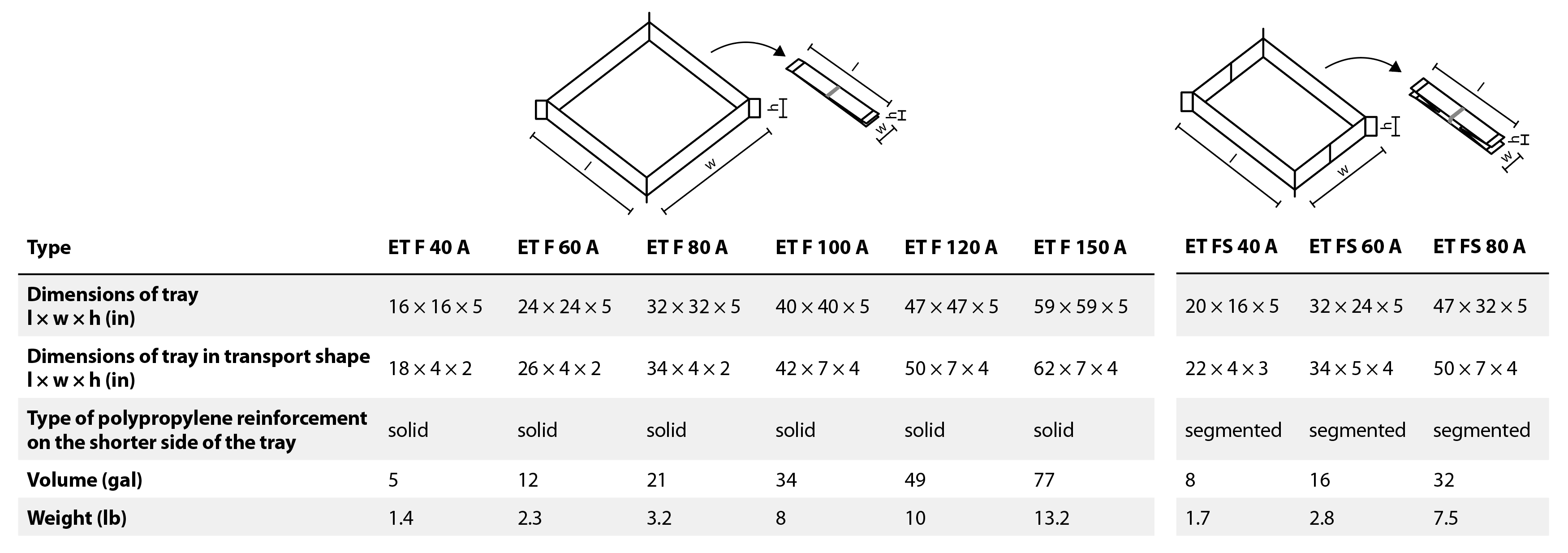 The tray is made of special PES/PVC material with low electrical resistance (electrical resistance is less than 10⁹ Ω). Used components are made of non-sparking materials. Tray and components are antistatic and designed primarily for environments with increased risk of explosion. Stability is ensured by welded corners and polypropylene reinforcements with a higher degree of strength implemented in the upper edges of the tray. As standard, selected types of trays have specially adapted segmented reinforcements, which enable the structure to be partially shaped. This function helps when placing the tray in a place that is difficult to arrange, allows you to shape the tray around an obstacle or facilitates the draining of retained liquid from the tray. The transport shape of the tray is provided by a strap with a plastic carabiner, which can be easily removed if necessary. The temperature range of use is +14 °F to +158 °F. The tray is suitable for indoor and outdoor use. After the ecological disposal of the captured substance, it is necessary to wash the tray with an appropriate neutralizing agent or soapy water and dry it so that it is ready for further use.